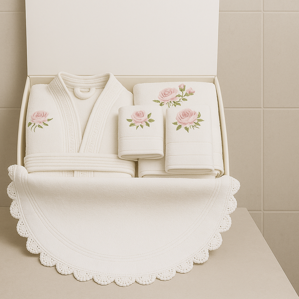 These Bridal Set Solutions, crafted from 100% cotton, include exquisitely embroidered robes, towels, and rugs adorned with delicate lace, offering a luxurious, customizable gifting experience tailored to the audience and occasion. The premium cotton ensures soft, absorbent, and durable performance, with intricate designs that enhance elegance and withstand use. Ideal for the discerning buyer, the sets provide a blend of practicality and sophistication, maintaining vibrancy and texture wash after wash. This thoughtfully designed collection combines technical craftsmanship with personalized charm, transforming bridal gifts into cherished keepsakes that elevate every celebration with refined luxury.