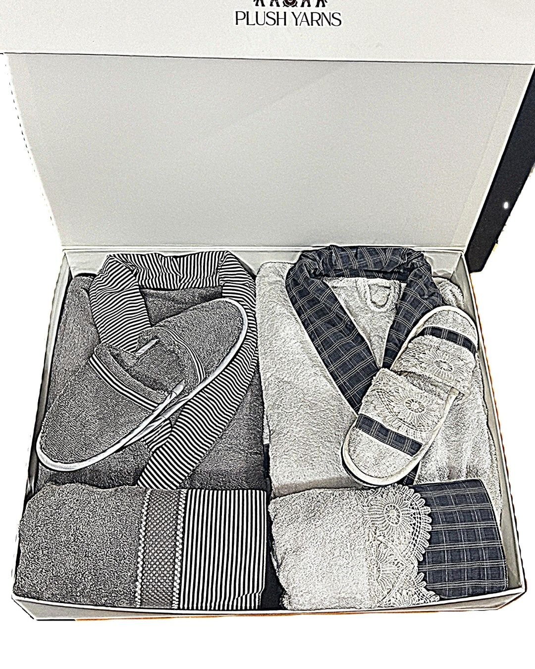 Set contains Robes (2), Bath towels (2), Hand towels (2), Slippers (2)